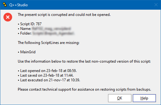 Q++Studio has tried to re-create the missing script lines, but has failed.