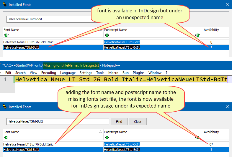 The solution solution for these rare cases is to create the text file(s) MissingFontFileNames_Quark.txt and/or MissingFontFileNames_InDesign.txt in the local folder C:\Q++StudioXV4\Fonts\ in which you can pairs of font names and corresponding postscript names that are missing, as shown at the bottom of the image on the right. This file must be copied on each individual workstation (listing fonts that are not installed will do no harm).